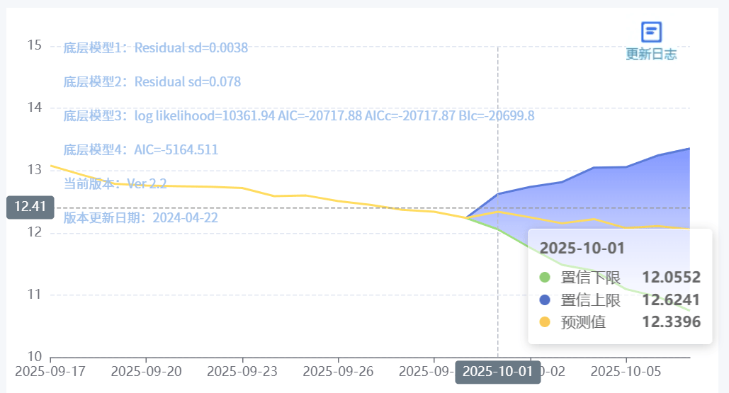 玄田算法是由项目课题组团队原创的非经典逻辑数值聚合理论和不确定性预测方法,构建了基于一致模算子的生猪价格预测模型。该模型采用的聚合函数及一致模相关理论与方法已获得多项国家自然科学基金和省级自然科学资金资助,并获得多项省级自然科学奖奖项。10月01日预测猪价为12.3396,置信区间在12.0552--12.6241之间。10月02日预测猪价为12.2501;10月03日预测猪价为12.1535。