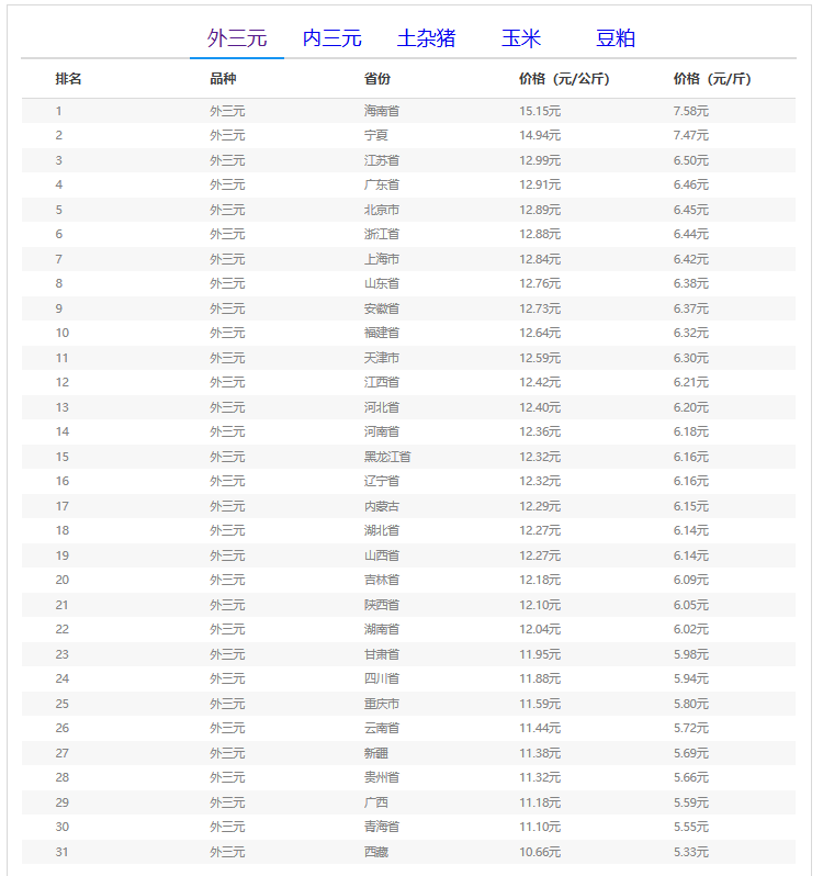 外三元排行后三:西藏自治区10.66元/公斤、青海省11.10元/公斤、广西壮族自治区11.18元/公斤;