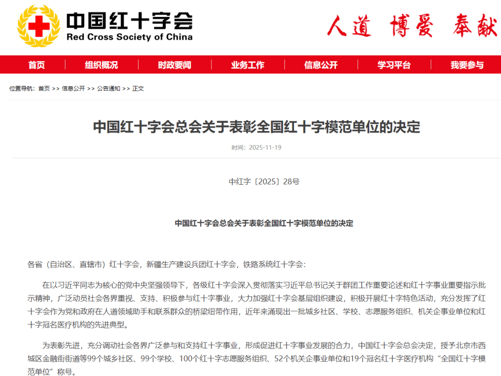 2025年,我省10个单位荣获中国红十字会总会授予的“全国红十字模范单位”称号