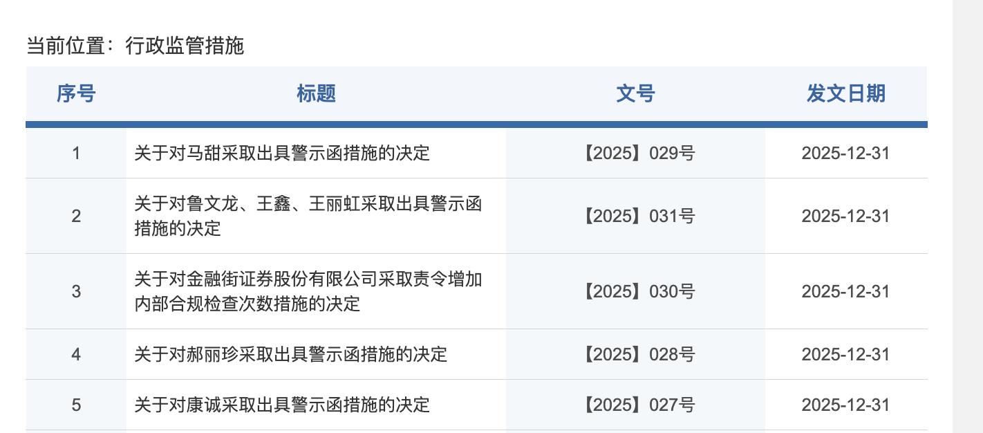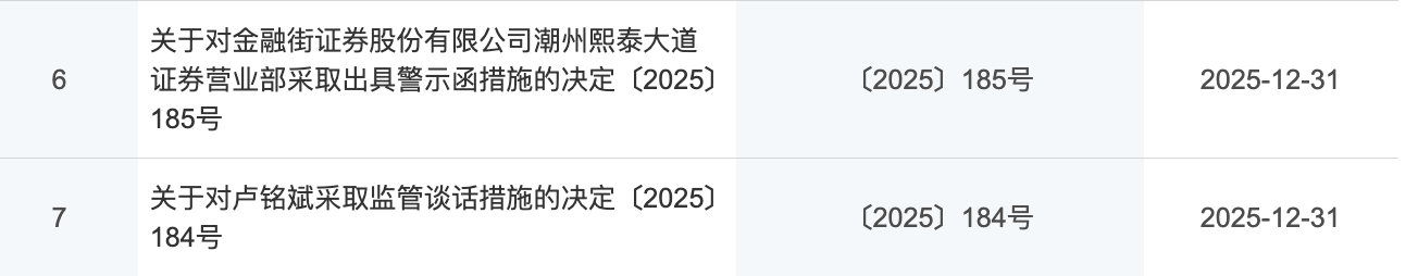 12月31日,证监会内蒙古监管局与证监会广东监管局同步发布监管措施,合计对金融街证券开出7份罚单,直指其私募基金销售等业务领域违规和存在“飞单”等行为。其中,内蒙古监管局对金融街证券采取责令增加内部合规检查次数措施的决定,针对其多家分支机构的涉事人员出具警示函。