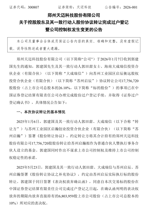 2026-01-09凤凰体育,凤凰体育直播,凤凰体育APP投资界消息,1月7日,深交所上市公司郑州天迈科技股份有限公司(股票代码:300807,以下简称“设立的专项并购基金苏州工业园区启辰衡远股权投资合伙企业(有限合伙)(以下简称“启明基金”)通过协议转让方式完成收购天迈科技的控制权(以下简称“本次收购”)。本次收购完成后,启明基金成为天迈科技的控股股东。
