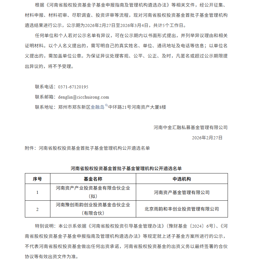 2026-03-03凤凰体育,凤凰体育直播,凤凰体育APP投资界2月28日消息,近日,河南省股权投资基金首批子基金管理机构公开遴选名单,基金名称为:河南资产产业投资基金有限合伙企业(拟)、河南豫创雨韵创业投资基金合伙企业(有限合伙);中选机构分别为:河南资产基金管理有限公司、北京雨韵和丰创业投资管理有限公司。