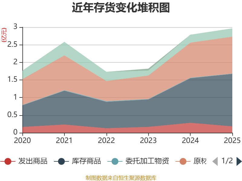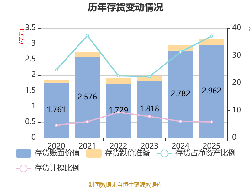 从存货变动来看,截至2025年末,公司存货账面价值为2.96亿元,占净资产的37.08%,较上年末增加1799.81万元。其中,存货跌价准备为1833.86万元,计提比例为5.83%。