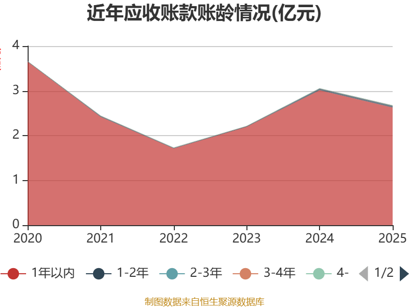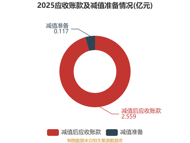 从应收账款账龄结构来看,截至2025年末,公司账龄在1年以内的应收账款余额为2.63亿元,较上年末下降3834.03万元,占应收账款总额比例为98.17%,较上年末下降0.27个百分点。