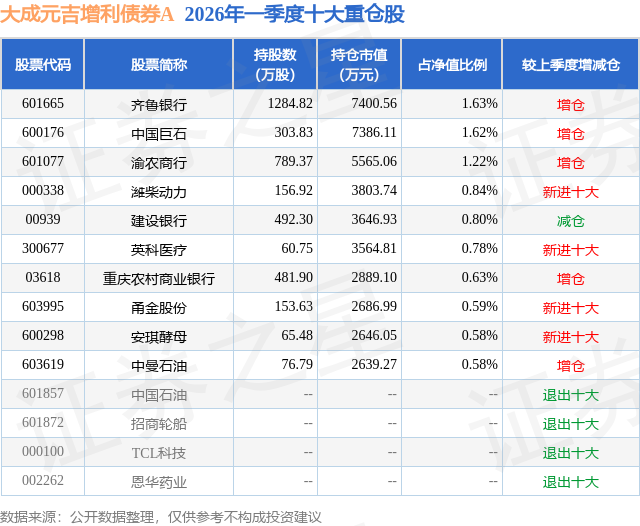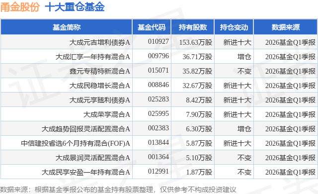 根据2026基金Q1季报公募基金重仓股数据,重仓该股的公募基金共10家,其中持有数量最多的公募基金为大成基金的大成元吉增利债券A。大成元吉增利债券A目前规模为33.34亿元,最新净值1.1478(4月24日),较上一交易日上涨0.01%,近一年上涨8.48%。该公募基金现任基金经理为王立 徐雄晖。王立在任的基金产品包括:大成债券A/B,管理时间为2009年5月23日至今,期间收益率为158.13%;大成景盛一年定开债A,管理时间为2020年12月16日至今,期间收益率为16.05%;徐雄晖在任的基金产品包括:大成汇享一年持有混合A,管理时间为2021年6月16日至今,期间收益率为26.96%;大成民稳增长混合A,管理时间为2021年9月17日至今,期间收益率为24.69%;大成景润灵活配置混合A,管理时间为2022年12月4日至今,期间收益率为31.66%;大成趋势回报灵活配置混合A,管理时间为2022年12月4日至今,期间收益率为60.77%。